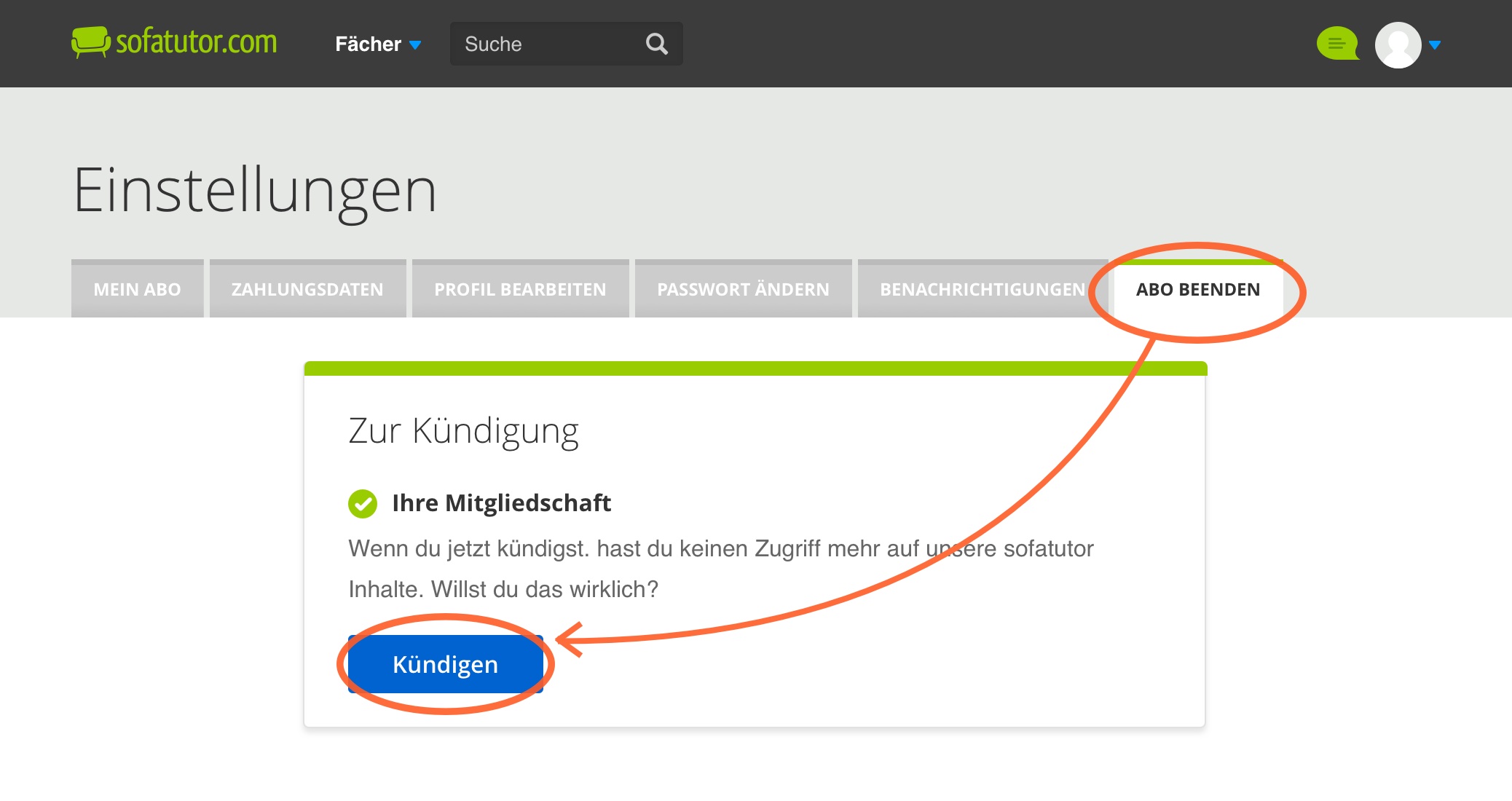 Wenn Sie sofatutor nicht mehr nutzen möchten, so genügt die rechtzeitige Kündigung in Textform (z. B. per Brief, Fax oder E-Mail). Sie können jederzeit zum Ende der von Ihnen gewählten Erstlaufzeit (z. B. 1 oder 12 Monate) kündigen. Wenn nicht gekündigt, verlängert sich Ihre Mitgliedschaft nach Ablauf der Erstlaufzeit zum unrabattierten Monatspreis auf unbestimmte Zeit und kann dann jederzeit mit einer Frist von einem Monat gekündigt werden.